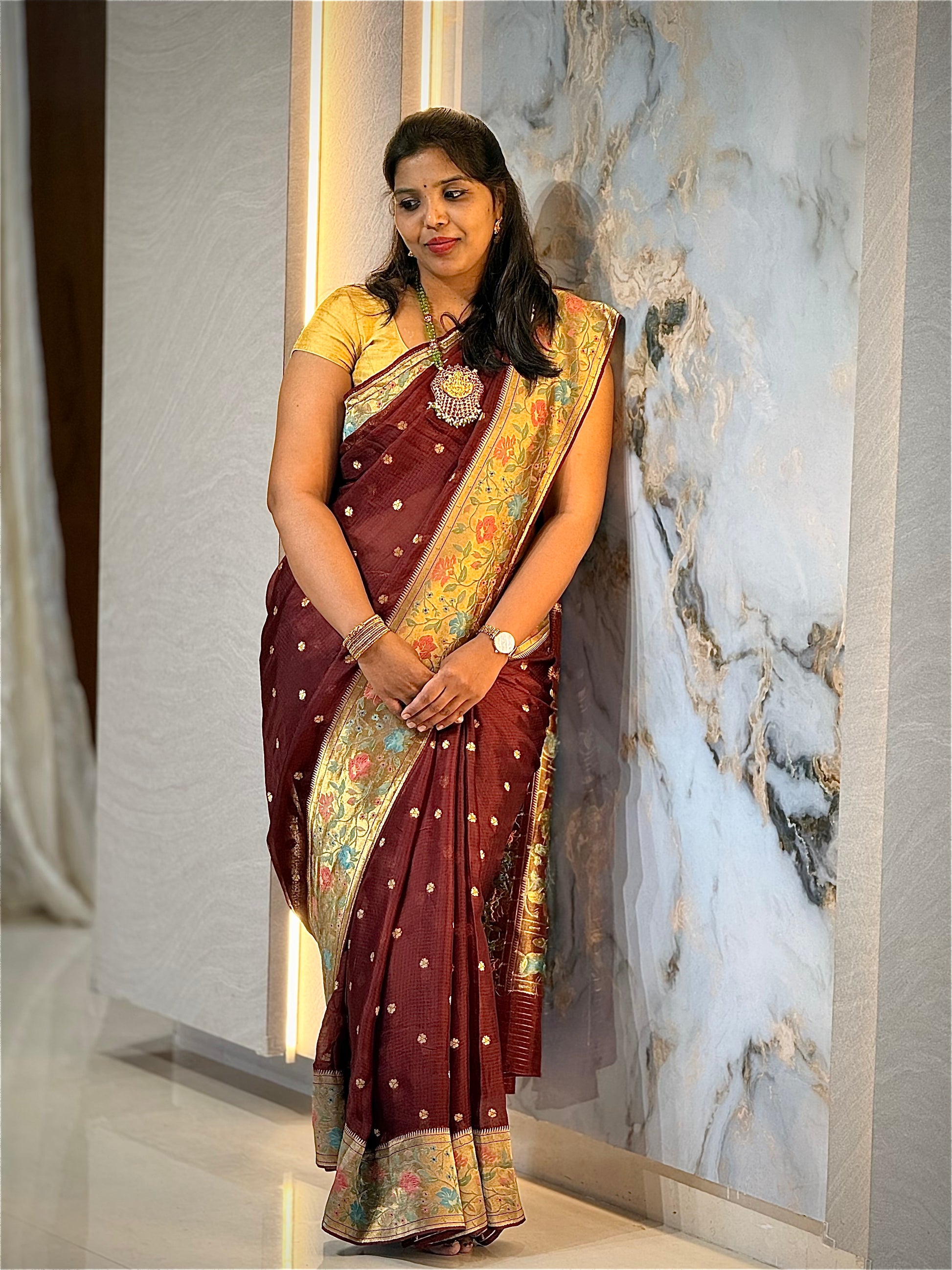 Dry clean recommended for first 3 washes. After that, hand wash separately in cold water using mild silk-safe detergent. Do not wring or twist. Dry in shade, away from direct sunlight. Store folded with muslin cloth between layers. Iron on reverse at medium heat.